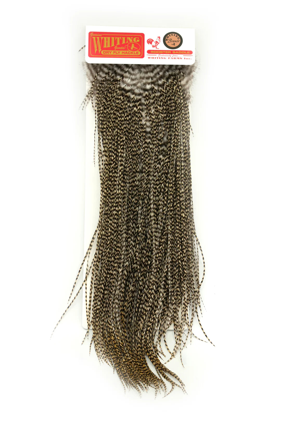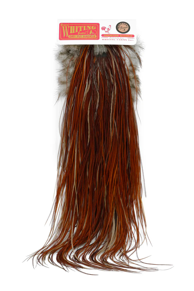 Whiting Bronze Saddle har långa, mjuka fjädrar kombinerat med utmärkt fjädertäthet, vilket ger premiumfjädrar som är perfekta för att skapa detaljerade och hållbara flugmönster. Dess naturliga flexibilitet och fyllighet säkerställer livfull rörelse och överlägsen prestanda i varje bindprojekt.